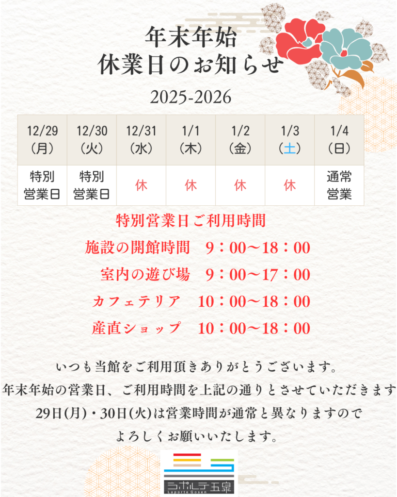 ラポルテ五泉は、2025年12月31日(水)~2026年1月3日(土)まで年末年始休館とさせていただきます。